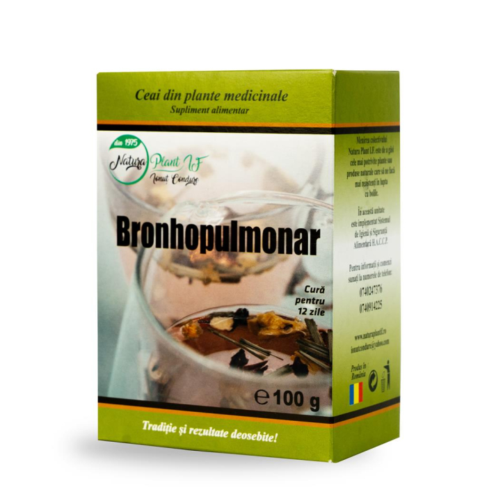 Descriere Conține: 100 gr. Beneficii și utilizări Susține sănătatea căilor respiratorii prin efectele bactericide și antivirale. Contribuie la reducerea tusei și a inflamațiilor căilor respiratorii. Ajută la ameliorarea bronșitei, astmului bronșic, faringitei, traheitei și laringitei. Favorizează expectorația și fluidificarea mucusului. Compoziție Muguri de pin (Pinii gemmae) Frunze de pătlagină (Plantaginis folium) Cimbru de grădină (Thymi serpylii herba) Flori de soc (Sambuci flores) Trei frați pătați (Violae tricoloris herba) Frunze de urzică (Urticae folium) Flori de ciuboțica-cucului (Primulae floris) Frunze de păducel (Crataegi folium et flores) Mod de preparare Adăugați o lingură de plante la 450 ml de apă fierbinte. Acoperiți și fierbeți timp de 1 minut, apoi lăsați la infuzat 10 minute. Strecurați înainte de consum. Mod de administrare Consumați 150 ml de ceai neîndulcit, cu 10-15 minute înainte de masă. Se poate asocia cu Extractul hidroalcoolic Bronhopulmonar: diluați o lingură de extract în 150 ml de ceai. Contraindicații Nu este recomandat copiilor sub 14 ani, femeilor însărcinate sau care alăptează. Contraindicat persoanelor alergice la oricare dintre componentele produsului. Precauții A nu se depăși doza recomandată pentru consumul zilnic. A nu se lăsa la îndemâna și vederea copiilor mici. Atenționări Suplimentele alimentare nu înlocuiesc un regim alimentar variat, echilibrat, și un stil de viață sănătos.